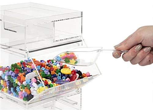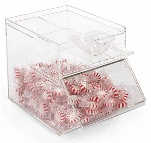 With a slide-in container lid and included scoop, this plastic candy jar makes it easy for your customers to stock up on sweet treats! Each clear acrylic dish comfortably rests on countertops and features a stackable design. Accessing contents couldn’t be easier, simply lift the container lid and slide it into the unit, making this a user friendly candy jar option even for patrons with their hands full. Don’t worry about keeping track of the scoop because these acrylic food bins include a designated slot to return the utensil when not in use. Whether you are planning on using this candy jar for a party, buffet, or store the design and functionality is sure to meet your every need. Stack multiple units together or line a counter with each side by side to make a plentiful cookie, food, or treats bar. Your party or store will benefit from these clear acrylic bins that offer visibility and options at a glance!