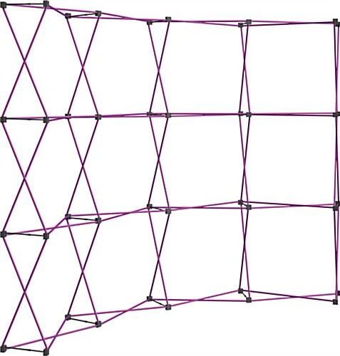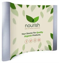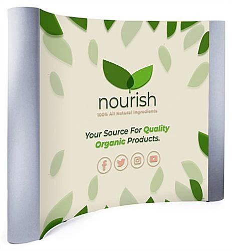 This 10’ trade show wall has a curved design that allows the custom graphic attached to the banner stand to grab attention from all angles and bring potential customers into your exhibit space. It is made with a pop up frame for easy set up as well as breakdown at the end of a busy exhibition. This curved trade show wall is ideal for the traveling entrepreneur with an included heavy duty carrying case on wheels that can also operate as a storage unit. It includes 4 panes of custom graphics that are digitally printed on 22mil. PVC panels with a virtual 1200dpi resolution that will not tunnel or separate even after continuous rolling and travelling. The curved light gray end caps provide framing for your brand banner and consist of hook and loop receptive fabric that attaches easily. This trade show wall is the ideal banner stand for creating a professional exhibit while saving time on setting up.