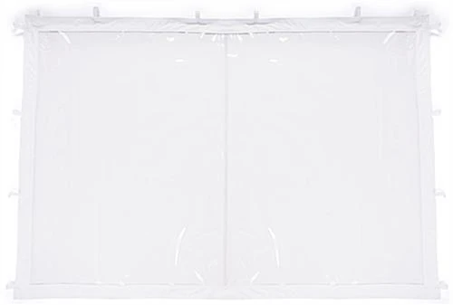 Our clear pop up tent sidewall keeps exhibit booth setups protected from unwanted elements and inclement weather conditions at your next outdoor event. This transparent vinyl partition includes 14 hook and loop attachments that can easily adjust or suspend within any 10ft or 20ft canopy display. Made of tear-resistant PVC material with a white polyester trim, this double-polished clear tent sidewall is designed to easily section off your exhibition area with minimal obstruction of visitors. Perfect for temporary setups, this outdoor canopy barrier assembles and disassembles within minutes! The lightweight construction of this clear tent sidewall with weather-resistant design allows it to be highly portable, perfect for traveling events such as trade shows, craft fairs, farmer’s markets, and more. Pair more than one of these fire retardant, phthalate-free, and latex-free vinyl partitions together for a custom closed-off showcase that meets your merchandising needs. This transparent anti-fog panel can also be used on 20ft canopy frames by connecting multiple units side by side. Conveniently clean each barrier using a non-abrasive washcloth with soap and warm water or our NOVUS cleanser solution ( sold separately). Ensure your exhibit booth and guests remain safe from wind or rain at any outdoor event with our weather-resistant canopy partition today!
