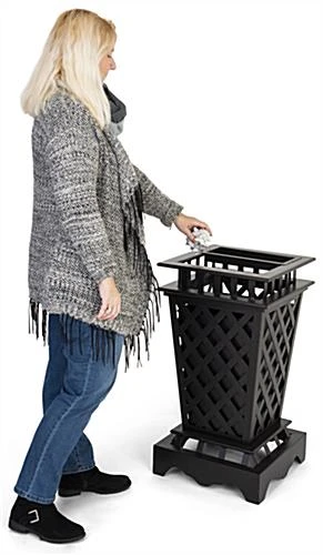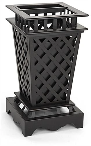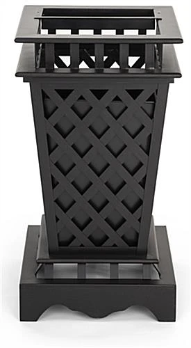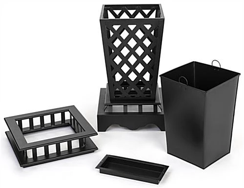 No more fiddling with swing doors or fast-shutting lids because this open top outdoor garbage can features a 13” wide opening. This beautifully decorative waste bin is constructed of cast aluminum and features a basket weave design on all four panels. With the 10-gallon capacity, this open top outdoor garbage can fits nicely in public parks, outside restaurants or office buildings, townhouse complexes, or anywhere you want to hide unsightly trash. This beautiful black decorative cast aluminum waste bin has a height of 33.5” and width of 18”. The container comes with an optional ashtray inside the top lid, which is removable for gaining access to the pull out bin. Help keep public high-traffic areas clean and litter-free with this open top outdoor garbage can.