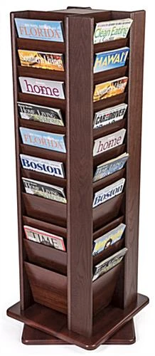 This spinning mahogany magazine rack has forty pockets measuring 9″ x 8″ x .75″. This tiered design allows you to have the front cover visible no matter how much literature is on display. The entire mahogany magazine rack rotates on its base making an easy browsing experience for customers. Entire dimensions are 18″ wide x 50″ high x 18″ deep. Each magazine rack features solid oak construction and a red mahogany finish. The durable and classy looking displays require minor assembly for a quick setup.