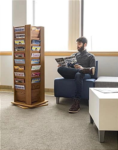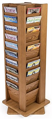 This revolving wooden magazine display features forty pockets on a revolving base for browsing. Each pocket measures 9″ wide x 8″ high x .75″ deep, the perfect size to merchandise catalog sized lierature. The wooden magazine displays are made of solid oak with a medium finish that adds warmth to a lobby, waiting room, or retail store. The dimensions of this floor standing fixture are 18″ wide x 50″ high x 18″ deep. With the magazine display’s tiered design, it’s possible to display up to 40 titles in one spot. Only minor assembly is required before it can be set up and used!