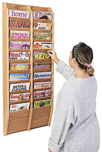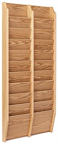 Our wall mounted multi magazine rack is a great addition to office environments with its classic design. Each tiered literature display is made of solid wood with a pleasant light oak finish. The mounted multi magazine rack has 20 pockets for 8.5″ x 11″ catalogs, featured in two columns with ten tiers each. The slots can each hold two 4″ x 9″ brochures instead of the letter size periodicals. Install the multi magazine rack with ease, as the back features pre-drilled holes and a hardware kit is included. Choose this tiered literature fixture for your waiting room, medical facility, or office lobby.