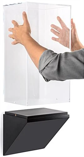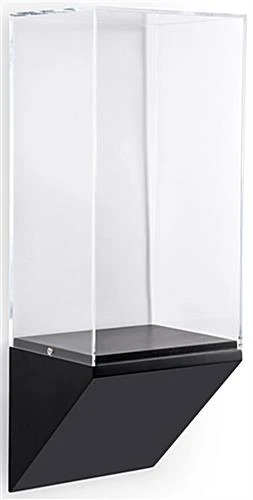 Whether for public display or use in a private collection, this museum pedestal wedge wall case features a sturdy design and beautiful, modern look to complement any space. The 10” wide exhibit shelf can support up to 55 lbs, making this ideal for large bowls, sculptures, and other heavier collectibles. With a modern tapered base and 18” tall rectangular acrylic vitrine, the black pedestal wedge wall case is easy to mount and offers a frameless view of stored treasures to enhance art galleries, libraries, or retail storefronts. Simply install the provided hardware on a flat surface and hang the MDF shelf using the recessed brackets, complete with an optional felt strip to prevent scratches and keep the unit flush. To display dolls, bowls, or sports memorabilia, simply lift off the acrylic vitrine, then mount on the base and screw in place along the sides of the rectangular enclosure to prevent tampering, an essential feature for retail stores, art galleries, and other public locations. Ideal for use in the home as part of a private collection or a commercial exhibit, this wedge wall case emulates the design of artifact-quality shadow boxes at an affordable price point.