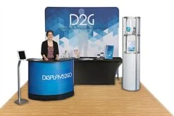 Impress attendees with a well rounded booth at your next trade show event with this complete exhibit package! Design a custom backdrop to be printed using a full color dye sublimation process and displayed on a lightweight, easy to knock down aluminum tubing frame. Confidently situate the graphic art backdrop on a neutral flooring option, a 10’ x 10’ wood grain foam tile component, which coordinates well with this all-in-one exhibit package. Transporting materials couldn’t be easier with a portable shipping container which also converts into a customizable display counter. Create an interactive trade show booth with this floor standing iPad stand, which is locking, tilting, rotating, and offers cable management. Showcase your products in style with an easy to assemble, round display case tower which sets up in minutes by merely twisting the unit until it is fully erect. Lastly, slip a 6’ black stretch table cover over your folding table (sold separately) and your exhibit package is finished! Look no further, we have gathered all the fixtures you could possibly need to meet every exhibitor’s dream with custom full color graphics design options at an affordable price.