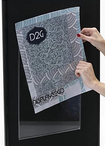 This sign frame, signage holder, is a great solution for advertising goods or services at a trade show. The easy to mount display is an inexpensive means of advertising. This sign frame attaches onto any receptive fabric products. No hardware or additional tools are necessary. This sign frame uses the included hook & loop technology to affix to fabric material. There are hook and loop strips on the back for quick attaching. Users only need to press the sign frame against the trade show booth. This unit is very convenient to use.