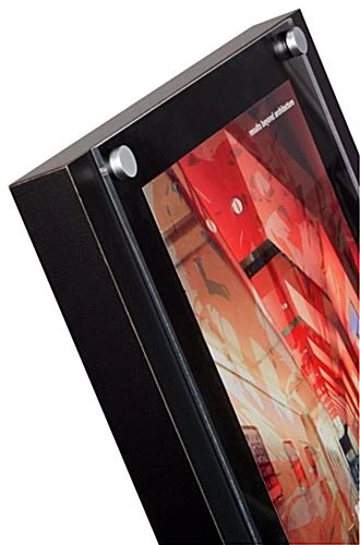 This magazine stand, also known as a freestanding literature display, is made of thick MDF with a black laminate. The sign stand accepts 11″ x 14″ graphics held in place by friction. Simply unscrew the top caps to insert or switch your graphics. This magazine stand, literature rack comes unassembled but takes only minutes to set up!