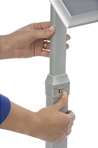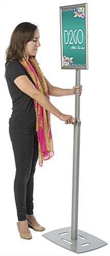 This silver 11 x 17 poster frame pedestal is the perfect way to catch the attention of passersby! Featuring height adjustability between 53”h x 72”h, the floor stand sign holder can showcase products on sale or other flashy advertisements at the ideal height for your location. The aluminum pedestal is built with sturdy construction for years of use. The simple to use sign holder snaps open on each side for easy access to the images or menus to be changed. A pedestal such as the one shown here is a great floor stand fixture for car dealerships, movie theaters, restaurants and many more types of establishments. Each display comes with a sturdy weighted base to keep the unit upright while in use.