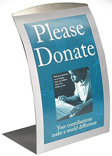 This picture holder, sign frame is an affordable option for displaying advertisements and other graphics! Place this print display in a lobby or waiting room to list office hours or special instructions for visitors. This sign frame is made of durable silver steel, a glossy finish to coordinate with any environment. Post this curved print holder at a hostess station to greet incoming patrons. Each sign frame, also known as a picture holder, accommodates 11″w x 17″h graphics. Use this print display to advertise menus, pictures, announcements and advertisements.