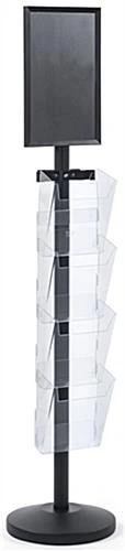 Designed to bring attention to promotional materials, this 11” x 17” sign post with 4 clear literature pockets is the ideal brochure holder & poster frame for hotel lobbies, banks, trade shows and more! Each poster stand has a viewing area of 9.75” x 15.75” which is optimal for viewing the advertisements even from a distance. The black sign post with a powder coated finish features a top loading design in portrait format for easily interchanging your graphics as needed. Also included with the stand are 2 anti-glare protective lenses which act as dividers for your posters and shield the images from dust or fingerprints. The sign post is the perfect way to promote your new business, products, or sales info through use of the catalog and brochure holder receptacles. Place your catalogs into the magazine dividers to catch the attention of potential customers or clients.