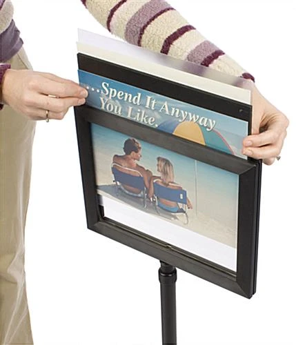 These sign frames are a great way to advertise messages to customers or patrons. Passersby can’t help but stop and take notice of the signage displayed in these stands. Sign frames like these are often seen in restaurants, directing patrons to ‘Please Wait To Be Seated’ or ‘Seat Yourself’. The simple design is easy to maneuver and takes up little floor space. These sign frames, also known as poster holders, can also be seen in retail businesses, museums, cafeterias and more. These poster stands are perfect for communicating simple, straight-forward messages to customers. Each of these sign frames are great to have as “back up” for unplanned events, such as ‘Show Cancelled’ or giving warnings like; ‘Wet Floor’. Since users can print graphics right off an everyday printer, these frames will prove to be extremely versatile!