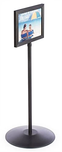 Poster holders, sign frames feature a telescoping, 1″ diameter pole, set atop a 14″ diameter base, holding a 12″ wide by 9.5″ high frame. The viewable area of message is 10″ wide by 7.5″ high. The pole upright extends so a message or advertisement can stand anywhere between 37″ and 60″ high. These sign frames are double-sided to broaden the scope of messages and feature (2) non-glare lenses to ensure a sign is readable from all angles. The framing also features a black expanded PVC backer so messages always stand upright, without sagging. This black expanded PVC backer can also be brought to a local sign shop to have vinyl letters applied for a permanent message. If at any time, your permanent vinyl lettering is not applicable or you’d like a different message presented, simply slide in an advertisement between the backer and the non-glare lenses. Remove when you’d like the permanent message displayed again. Sign frames ship unassembled. All necessary hardware and instructions are included for quick, simple, 1-person assembly.