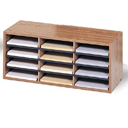 This wood literature organizer with 12 compartments can fit all kinds of papers and documents. Each sorting box can be used on a desktop or countertop. The wood literature organizer, sometimes called a wooden mail sorter, is sure to increase the efficiency in any office. The paper rack easily categorizes important papers, publications, stationery, and general classroom supplies. The literature organizer is constructed from 5/8″ compressed wood with medium oak laminate finish and features a rigid, durable backing. The inserts that form the compartments are constructed of the same material as the backing, and create (12) 9″ wide x 11.75″ deep x 2.5″ high letter size compartments. The front lip of the slots has black plastic molding, which stabilizes the rack and gives it a finished look. Stick-on labels are included, so users can identify the correct slots and keep files in the correct order.