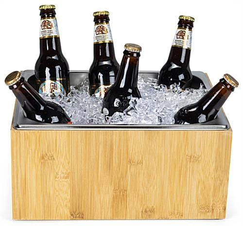 Showcase your favorite libations or food items in this bamboo ice pan holder and draw in your guests for a refreshing drink. This 13” x 10” beverage tub features a 5.5” deep removable stainless steel tray providing ample room for a variety of bottles, cans or food items. The ice pan holder with a natural bamboo finish will complement any décor and will conveniently fit on any table or countertop. Perfect for buffets, breakfast bars, catering events, hotels, cafes, and even home use, this beverage tub makes the ideal stylish serving cooler. With its open-top design, your customers will be able to view their options for quicker selections. Crafted of natural wood and stainless steel, this ice pan holder is a durable and stylish serving cooler built for extended-lasting use.