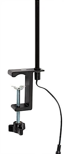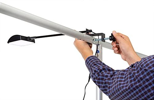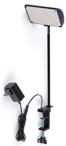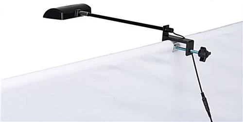The display lights for trade shows have an adjustable 60 degree range. The clamp will fit with anything from a poster to pop up unit. The portable banner stand display lights are made with a strong ABS plastic as well as iron and aluminum to prevent overheating. The 60 degree range is great for larger exhibits or smaller spaces. The display lights are supported by a strong 3M wire and clamp for easy installation. Buy your banner stand and exhibition accessories at Displays2Go today!