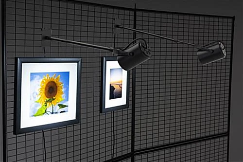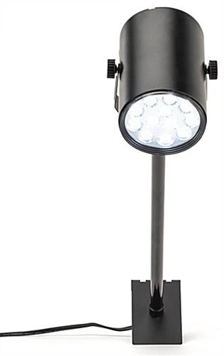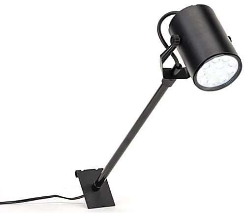 This gridwall lighting fixture has a cool-toned light color that will beautifully illuminate your displayed products, artwork, or photography at your next trade show, art festival, or outdoor market. Each LED spotlight clips to any wire display grid for a quick and straightforward lighting solution at your next event. This black gridwall lighting fixture has an adjustable head and length feature to suit your changing showcasing needs. This spotlight has a 9-foot cord giving you flexibility when setting up your booth at a trade show or art festival. These display lights have a durable steel and glass design with a black powder-coated finish. Each LED gridwall lighting fixture only weighs around 2 pounds providing you with a lightweight solution that is easy to travel with from one event to the next!