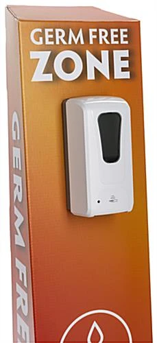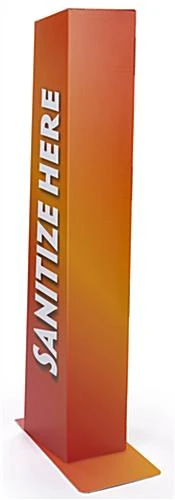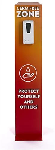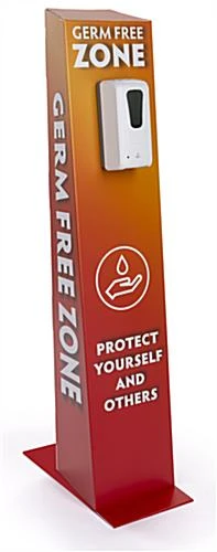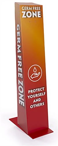 Use this disposable hand sanitation floor stand to help combat the spread of bacteria, germs, and viruses and maintain essential hygiene practices. With features such as a battery-operated automatic dispenser, 1000 mL refill container, and vibrant stock graphics, this freestanding station is ideal for trade show booth entrances, restaurants, and other high-traffic areas. This 60″ tall portable, disposable hand sanitation floor stand is an excellent solution when soap and water are not readily available in public spaces for hygiene purposes. The pre-printed automatic dispenser works by simply positioning your palm underneath the sensor and can help combat cross-contamination in the workplace and public areas. Patrons, employees, and guests will appreciate having essential hygiene gel readily available. Our hand sanitation floor stand with vibrant red gradient stock graphics can protect your business and customers with its touch-free dispensing operation.