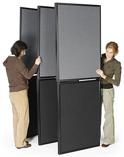 These black display panels create perfect backdrops for within trade show displays and presentations. The folding pop up exhibit, black display panel is made up of ten fabric boards attached together in two sections of five. Simply connect the top portion to the bottom, using their folding design to create a unique backdrop presentation. (Please view our images for more details.) Black display panel, also known as portable trade show display, is equipped with hook and loop receptive fabric so you can easily attach sign frames and literature pockets to an exhibit.