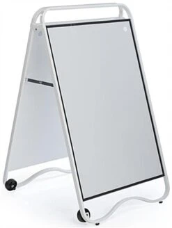 The outdoor cone sign has a signage area measuring 13″w by 15″h. The plastic street sign is double-sided allowing for maximum visibility by possible customers. Each outdoor cone sign is constructed from durable polyethylene, which prevents the unit from rusting and splintering. Furthermore, the black color is neutral for use in any type of indoor or outdoor setting. Each outdoor cone sign has a base that can be weighted down with either water or sand. This gives the owner more flexibility, allowing the plastic street poster holder to be left outside in the wind. The outdoor cone sign that is unassembled takes just mere minutes to put together. Absolutely no tools are required to assemble your plastic street display! At a height 47″ tall, this plastic street display is a sure way to be seen by almost everyone who passes by it! Vinyl graphics are not included with this unit!