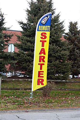 The remote starter feather flag that is inexpensive will generate additional sales for your car service business, especially in the winter months. The larger banner sign is far more effective than a typical outdoor a-frame since it is easier to see by passing cars. This remote starter feather flag that is 14′ high will be noticed by all whom drive by your establishment due to its immense height. Each banner display helps customers know that a service is provided that they might not have otherwise noticed. The remote starter feather flag that pivots on the ground stake will swivel with the wind’s direction. The lack of a nylon carrying bag is what helps to contribute to the low prices of this display, making this banner the ideal tool for stores and businesses on a budget. Each remote starter feather flag can be strategically placed on the roadside or in the front area of a store for high visibility, wherever there is a soft surface. The banner display is perfect for car dealerships and auto body shops.