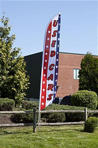 These car dealer flags are designed so that the banner is always visible and does not curl in the wind. This signage has bold red text that spans the entire banner top to bottom. These message banners, car dealer flags are the ideal tool for used auto sellers to create enthusiasm from passerby customers. This advertising feather pennant is a staple for used automobile establishments due to the universally recognized message and red,white, and blue colors. These star spangled car dealer flags stand 14 feet tall and display “USED CARS” in a vertical orientation. This outdoor flutter display is designed to always be visible and not curl, even in the wind. This red white and blue swooper includes a pre-shaped aluminum pole that forms the blade pennant.
