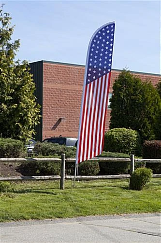 These patriotic wave banners that are for outside use flutter in the wind for an eye catching effect. This USA flag display includes a metal ground spike that can be reused and relocated as desired. These stars and stripes patriotic wave banners can be set up in minutes. This feather flag is economical for small business seeking higher exposure. These patriotic wave banners that are ideal for businesses can be placed by the roadside to grab the attention of passerby customers. This signage pennant has a pole sleeve so users can simply slide onto the aluminum pole. These patriotic wave banners are portable and can be taken down at night or during inclement weather. This USA swooper is printed on a poly knit material for vivid coloring and durable outdoor use. These patriotic wave banners have a stay open design so the usa colors pattern is always visible with or without wind. This signage is inexpensive!