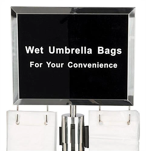 Purchase this wet umbrella silver stanchion sign holder to set you apart from other businesses and shopping centers that are using your typical rope barrier crowd control setups. The 14”w x 11”h frame contains white text and a double-sided pre-printed message. The disposable plastic sleeve accessories can be purchased separately from the silver stanchion sign holder to provide guests a wonderful and safe shopping experience during inclement weather. The frame simply attaches to the top of your existing QueuePole.Economy post. Don’t miss out on the new trend in crowd control and rope barrier setups. Facilities and grounds accessories such as this stanchion sign holder are gaining popularity and are a great way to identify your company as one that cares about customer safety and reducing slippery floor hazards.