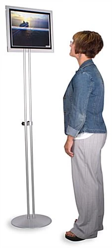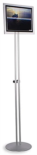 This menu display offers a stylish way to showcase 17″ x 11″ signs. Built upon a double metal pole and base, our stand raises and lowers to the desired height. A thick acrylic plate at the top holds your sign underneath the magnetic lens. Unlike traditional frames, the lens provides effortless insert changes. The sign holder also rotates a full 180 degrees to align to either landscape or portrait orientation. An excellent addition to your lobby, restaurant, or other business!