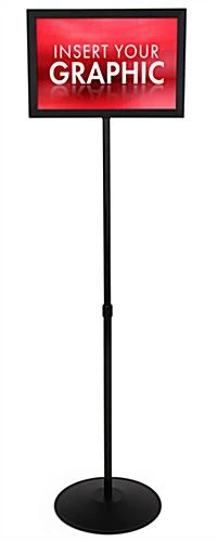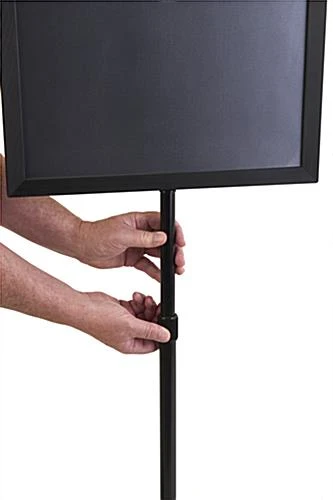 This sign holder, metal sign frame is constructed from black powder coated aluminum. The stand features a telescoping pole, so users can adjust the framing height between 40″h and 63″h. This poster holder accepts up to (2) 17″ wide by 11″ high messages in its double-sided framing. To assemble, simply place a sign between the black expanded PVC backer and the non-glare plastic lens (repeat on opposite side, if necessary) and slide in the top channel of the metal sign frame. To further save you money, many business printers are capable of printing 17″ x 11″ advertisements right in an office; no need to have a small run done at a sign shop. However, another great feature of this metal sign frame is the ability of the black expanded PVC backer to have vinyl letters applied at a local sign shop, to create a more permanent message. This unit ships unassembled. This metal sign frame includes all of the necessary hardware and instructions for a quick, one person assembly.