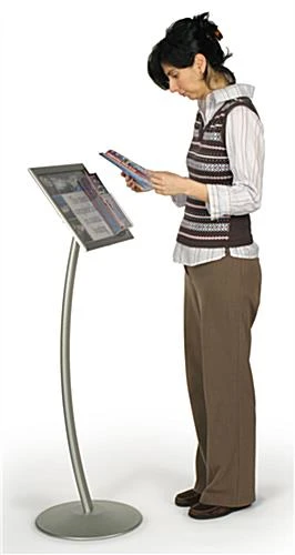 This sign frame has an acrylic brochure pocket attached to the protective lens cover. The brochure holder allows graphic designers to coordinate and integrate literature with printed signage. This sign frame has a modern design with its concave, curved column accentuating any lobby, restaurant, or retail environment. The snap open framing allows for easy changes of the graphics. Each sign frame features a non-glare lens that both protects the signage and minimizes the effects of overhead fluorescent lighting. The display height of this poster stand is ideal at just under four feet high. Shoppers can read the printed message on housed within this sign frame, and then take a pamphlet for further information. The combination of the pocket and poster holder is a very effective marketing tool.