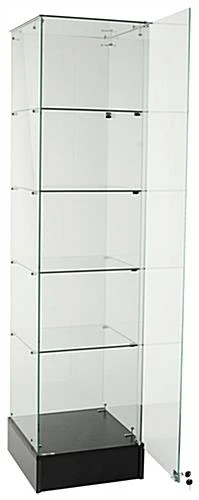 This retail tower display case has a frameless design that creates a custom and seamless presentation for jewelry, high price items, and collectibles. Glass showcases aid in creating a unified focal point, whether it is in the middle of a sales floor or as part of a museum floor plan. What better way to draw a customer’s attention than with a full vision tower display case, which may be compact in construction but does not lack in capacity for merchandise. Conveniently and confidently store merchandise with a high price value in a manner that exudes style and sophistication. By removing obstructive framing from this tower display case it provides a complete view for items on sale or being showcased. Products placed on the (4) tempered shelves in the glass showcases are safely locked away from prying hands that can tamper, vandalize, or steal. Including store fixtures, such as freestanding showcases into your collection of counters and cash wraps will aid in creating a custom and appealing merchandising presentation. For the price these glass showcases are being sold at, it would be a steal to buy today! Please reference provided instruction sheets and video for assembly directions.