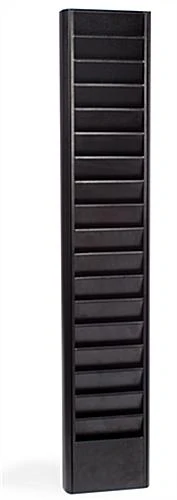 This catalog holder, wall magazine rack has (18) pockets to accommodate many magazines. Each pocket is spaced to allow ample room for the magazine covers to be shown. This wall magazine rack, like a mounted catalog display and a literature holder, is made of metal, ready to withstand a lifetime of use. A wall magazine rack features a textured black finish, to fit in with a variety of settings. This mounted catalog holder is the perfect wall magazine rack for use in doctor’s offices, hospital waiting lounges, and other reception areas.