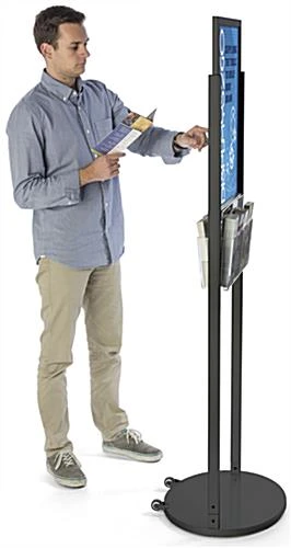 Introducing the black 18 x 24 wheeled poster display with 8 pamphlet pockets, this creative model is the textbook example for all your promotional needs! Coming in a glossy powder coated finish, this sign holder frames your graphics, prints, and more! With many optional choices for presenting leaflets, flyers, and circulars, the poster display comes with an acrylic brochure case that has interchangeable dividers giving you the selection of panel your materials require. When adding your photos or prints to the frame you can take advantage of a double-sided view feature with which the sign holder can showcase your prints from two angles. Also featuring a rolling base, the panel is a breeze to move around to compliment your promotional desires in any retail setting!