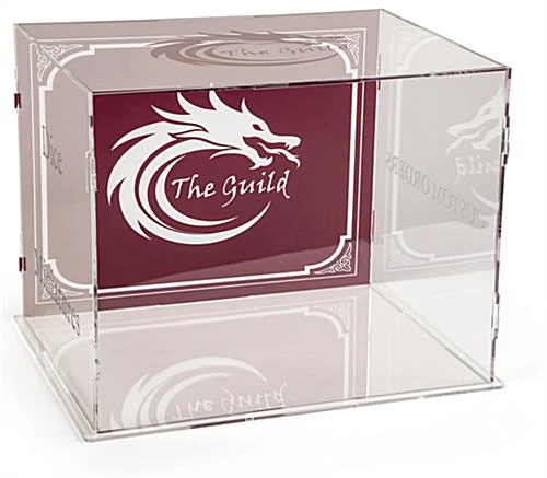 This 6-sided printed display riser case creates a fully-realized retail or trade show countertop exhibit through fully customizable, all-over graphics. Choose to cover any or all of the clear acrylic surfaces with your logo or place an attractive backdrop behind showcased products to entice potential buyers. This collapsible printed display riser case assembles using no hardware or tools, so setup and breakdown is quick and mess-free. Each piece attaches together using clear interlocking tabs that hold fast. For added convenience in transport, this acrylic branded box knocks down and packs away into one lightweight, nearly-flat stack of panels that can be easily carried by one person. Make your countertop exhibit stand out in a crowd by utilizing vibrant, high-quality graphics that work in tandem with your showcased item to provide a rich visual experience. Whether you choose to create a branded box to broadcast your logo or use a vibrant backdrop to highlight the details of your merchandise, this printed display riser case is an easy and effective way to enhance your presence at the next event or public gathering.