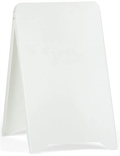 Made from cheap plastic polystyrene, this A-frame sign should be used with vinyl adhered text or with taped on signs. Writing with markers will leave permanent markings.