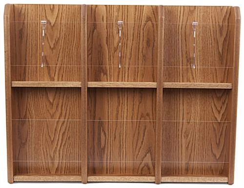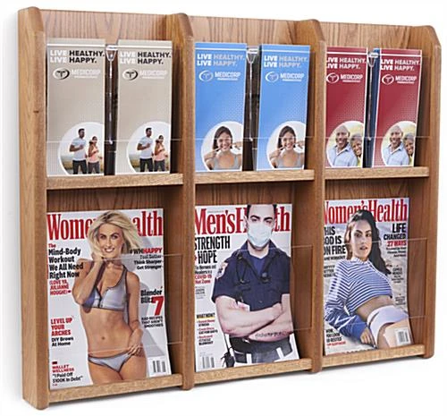 Organize reading materials for patients and visitors with this space-saving 2 tier magazine holder. The wall literature rack installs easily thanks to pre-drilled holes in the frame. Our 2 tier magazine holder features six slots for full-size periodicals. Want to include 4″ x 9″ brochures as well? Use the pocket dividers to split the slots into two for standard folded pamphlets. The solid oak 2 tier magazine holder is made in the USA with domestically-sourced materials. The rack also comes with a medium oak-stained finish designed to blend in with virtually any interior decor. Reduce clutter on waiting room tables and chairs with a wall mount literature holder!