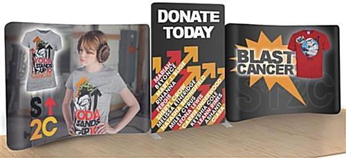 This exhibition display, known as a modular graphic mural, is the ideal tool for trade show use. These banner stands come with 3 separate panels, and allows users to submit a custom design for each one! Each custom exhibition display features (2) 7′ 6″ x 7′ 4″ panels and (1) 4’9″ x 8′ panel. These panels feature a flexible material that wraps around the interlocking frame, leaving a professional wrinkle free presentation. Each individual frame for this stretch graphic exhibition display comes with a carrying case for portability. These custom design banner stands are ideal for placing behind an exhibit table, and can be set up in several different arrangements. This stand also includes connector pieces to hold all 3 panels together. Easily set up this exhibition display that has two 8 foot graphics by snapping the poles of the frame into one another.