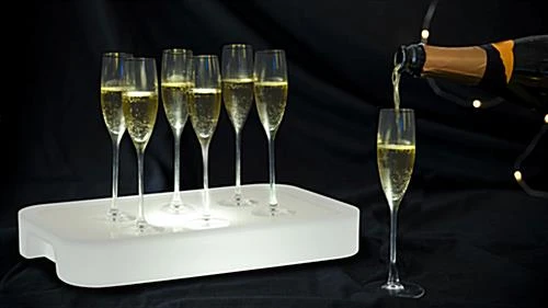 This multicolored rectangular LED light up serving tray provides hours of dazzling illumination poolside, bar side, or at your next special gathering. Think of the fun you can have when you use this glowing display as a bottle holder. Ideal for all entertainment establishments, this light up serving tray is lightweight, easy to carry, and has a weight capacity of 44 pounds. Enhance your bar, nightclub, or event with this fun LED illuminated bottle holder, which also doubles as a snack display. A rechargeable battery allows for up to 10 hours of consistent ambient glow. This 20”w x 12”d rectangular light up serving tray is a modern and futuristic way to entertain your guests.