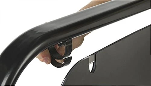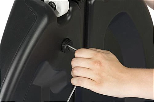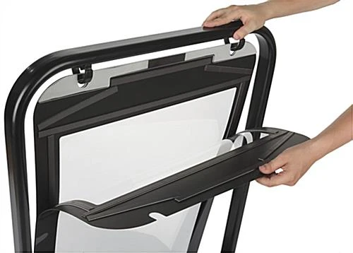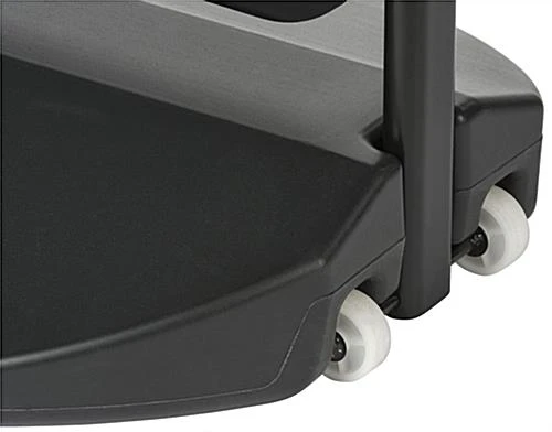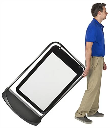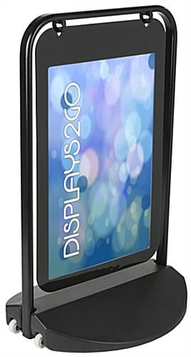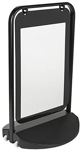 This swinging pavement sign is great way to advertise your shop or business with a double sided lens for twice the promotion! Standing on a plastic water-filled base, this promotional display features two rings to mount the lens pocket. The pocket included with this steel pavement sign for 20” x 30” posters easily opens to insert your double sided graphic and protects them from the weather, as the lens is water proof and wind resistant. To help stabilize the unit, the water base holds 4.75 gallons and rock salt is included for cold weather. Moving on 2 built-in wheels, the graphic display rolls effortlessly on sidewalks and can be brought inside after your shop closes for the day. Requiring no tools for assembly, this pavement sign can be quickly built and be put to immediate use outside your store!