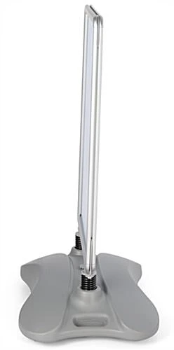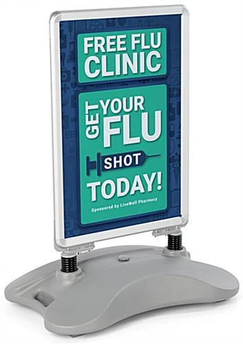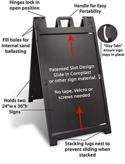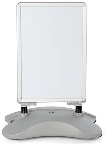 Business signs, sidewalk signs, and other outdoor signs have a waterbase that helps prevent your portable display from tipping over during windy conditions. You can fill this base with sand or water to help stabilize this out door stand. The base on these outdoor signs makes the unit perfect for high traffic areas. Set this unit up on sidewalks, road-sides, and other places that people frequently pass. Outdoor signs use (2) springs to attach the sign board to the waterbase. These springs allow your display to sway with wind to help prevent it from tipping over. These outdoor signs are designed to function well in mild winds. Whereas other a-frames fall over, this pavement signage stands tall. Sidewalk signs, outdoor signs feature wheels on the base and a molded handled to make this display easily portable. This allows you to bring the advertising sign indoors during the night without too much effort.