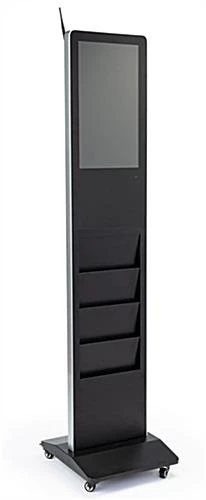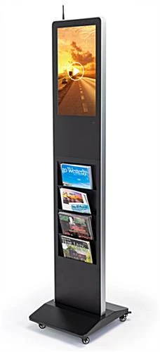 Our freestanding magazine rack digital signage kiosk features a slim state-of-the-art design to attract your customer’s attention and create an interactive and professional business environment. The digital literature stand with 21.5” LED HD display allows you to play company videos, marketing slide shows or corporate promotions. Turn this freestanding magazine rack digital signage into a profit center by selling advertisements to local businesses, displaying upcoming events, pricing and promotional business information. Use this digital literature kiosk to provide your customers with more than just magazines or flyers; the media display will provide entertainment, digital information and a complete digital hub to increase customer engagement. The advertising screen features an integrated Android OS, Bluetooth compatibility, and WIFI capability with (2) 8-watt sound amplifying speakers. The freestanding magazine rack digital signage moves around swiftly with the (4) smooth gliding locking casters to allow the stand to be placed in the optimal business location. The locking casters are optional use so that the unit can be displayed without them if desired to create a stationary unit.
