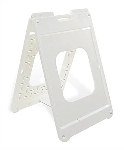 This is a plastic a-frame sidewalk sign designed for outdoor use. These signs can handle various weather elements. This is also a plastic a-frame that is very durable. These signs are made with polyethylene plastic for years of use. This plastic a-frame is resistant to splintering and rusting. Advertisers can set the unit up indoors or outdoors and enjoy a long lasting display. When the plastic a-frame is open, each unit locks to prevent over-extending which prolongs the life of the item. Customers can also place orders by 3PM to qualify for same day shipping.