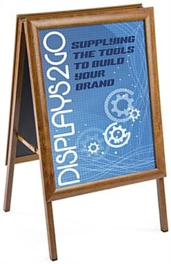 This 22″ x 28″ wooden sidewalk sign is the perfect display for your retail store or dining establishment. The double sided A-frame is designed with a snap open design to install your prints with ease. The faux wood sidewalk sign gives the impression of a natural wood look on an aluminum frame for durability. Included with the unit are 2 non-glare PVC lenses which provide protection for your pictures and reduce reflection when in high traffic and well lit areas. This sidewalk sign features a double sided display with a sleek design aesthetic for maximum exposure. Place the frame outside of your store when weather permits to advertise products and increase sales.