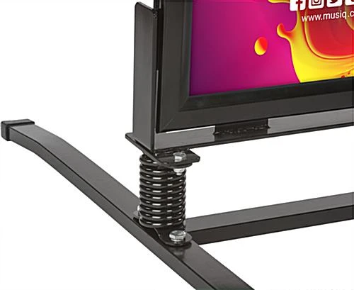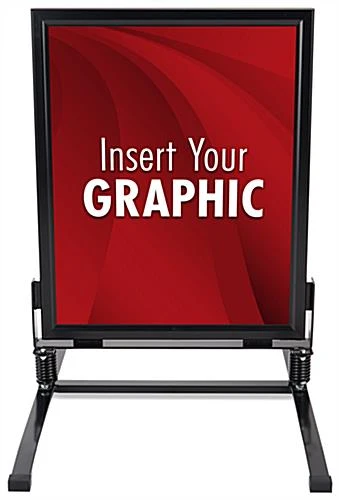 This outdoor sign stand is a sturdy and reliable option for a sidewalk poster display. The powder coated steel springboard base is anodized so it will not rust, making it a great fixture for advertising outside. Use the double-sided black sign stand to hold two 22” x 28” posters safely in place with a reliable snap frame construction. Interchanging your graphics is easy, allowing you to diversify your outside display whenever you’d like. The sign stand’s snap frame has a magnetic strip lining the interior, which holds a non-glare PVC lens in place to keep your graphics protected from inclement weather conditions such as wind and rain. Advertise outside without fear of weather damage to your marketing material by using this sturdy sidewalk poster holder.