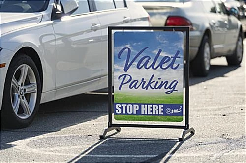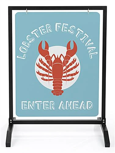 Boost advertising efforts with a 22×28 black metal sidewalk sign holder for outdoor. Each graphics frame includes ring hooks to attach a poster panel. The outdoor metal sidewalk sign holder features a weighted t-style base to hold firm in wind. Each graphics frame does not include a poster panel, but can be purchased separately. This sidewalk sign holder offers a quick-change option with included ring hooks. Display this frame in windy conditions on the curb outside your business!