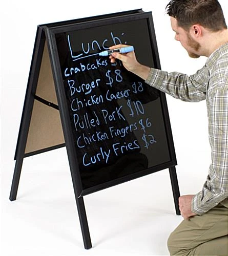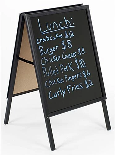 This A-frame, menu board will brightly display information to your customers! The use of attractive markers on the signage will certainly draw attention. For fast changes, the menu board features a snap-open frame for easy access. The borders quickly flip open for inserting posters or the lens. This menu board, also called an a-frame sign, features a collapsible design for easy storage when not in use. The pavement signage closes flat fast for transporting. To set-up, simply pull the two sides apart and snap brackets inside the menu board into place. The set-up process takes only a few seconds. This menu board, or wet erase signage, also features an anti-glare lens to make both reading easy and protect from the weather. Although the use of this lens is optional, the lens is a good idea in highly trafficked areas. A-Frames, wet-erase, and other menu board options offer a convenient and quick way to advertise specials to your customers. The key to great promotions is keeping people in the know.