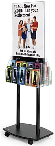 This poster display fixture holds (2) 22″w x 28″h posters for double-sided viewing. Includes two 10 pocket attachments, one for each side. Black base measures 24″ wide by 18.” Fixture is 67″ tall not including the casters. (Casters add about 3″ to the total height.) Comes with 4 locking roller wheels and all hardware. Removable peg dividers can be configured to hold standard 4″ brochures or 8 1/2″ wide letter size literature.