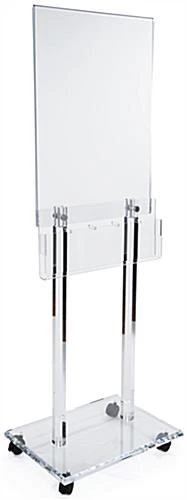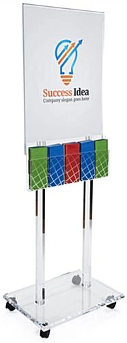 Display Stand – This display stand for posters and literature stands 67″ tall and holds (2) 22″w x 28″h posters for double-sided viewing. 5- pocket brochure holder attachment on one side with adjustable dividers. The pocket rack can be configured anytime for standard 4″ wide brochures or 8 1/2″ wide literature. This acrylic sign stand moves freely on (4) locking casters. Easy assembly required, all hardware provided. Base dimensions are 24″ wide by 18″ deep. Also available in many stationary versions, see related products below.