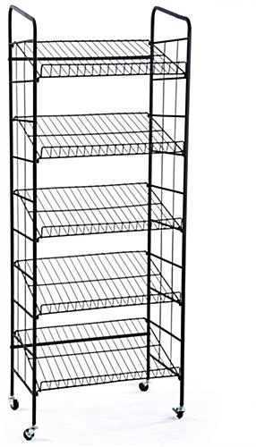 This 63”h wire bakers rack is a great kitchen storage fixture for commercial restaurants and pastry shops. Each wrought iron style black shelving display is constructed of mild steel for long lasting use in high traffic environments. Many chefs use the lightweight bakers rack to cool fresh bread and bagels, due to the (4) locking wheels which make it easily transportable from kitchen to storefront. The black shelving unit for restaurants is made to look like traditional wrought iron, yet is sold at a much less expensive price point. Storage units, such as the one shown here, helps organize backrooms of restaurants and bakeries. Order this bakers rack for extra backroom food storage today!