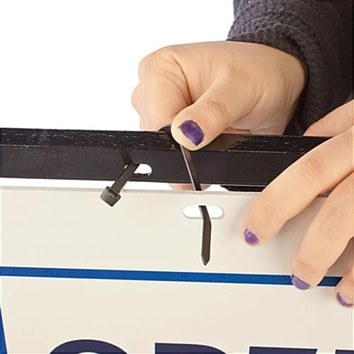 This real estate signholder, yard sign features a sturdy steel frame and is designed for outdoor use. Each frame features pointed legs for users to easily push the frames into soft ground. This helps to prevent the yard sign from easily blowing away. The lightweight design of this political signholder stake allows users to easily carry and set them up in any outdoor location. This yard sign does not include printed graphics or signage. Users are required to prepare their own graphics. Printed graphics can easily be attached to the yard sign frame using zip ties (not included with purchase). When creating advertisements, the use of rigid poster materials is recommended.